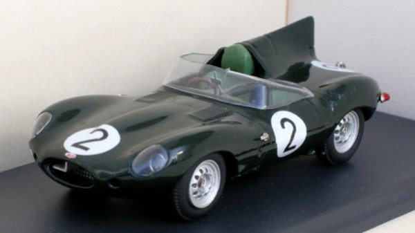 1/43rd scale handbuilt white metal model of Jaguar D type racer, Jaguar factory team car #2 as driven by Paul Frere and Dennis Titterington at Le Mans in 1956. Mounted on base with outer box.