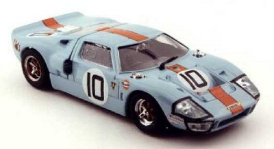 1/43rd scale diecast model of the the Ford GT40, car #10 as driven at LeMans in 1968 by Paul Hawkins and David Hobbs. Rear cover opens to show engine detail. Made by Bang, mounted on base with plexi cover and outer card box.