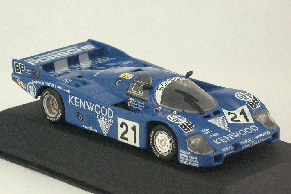 1:43 diecast model of Porsche 956, car #21 as driven by the team of Mario Andretti, Philippe Alliot and Michael Andretti to third place overall at Le Mans in 1983. Made by Quartzo with base, plexi cover and outer box.