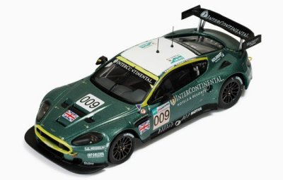 1:43 scale diecast model of the Aston Martin DBR9, car #009 as driven to class victory at LeMans by Brabham, Rydell, and Turner in 2007. Made by Ixo, mounted on base with plexi cover and outer box.