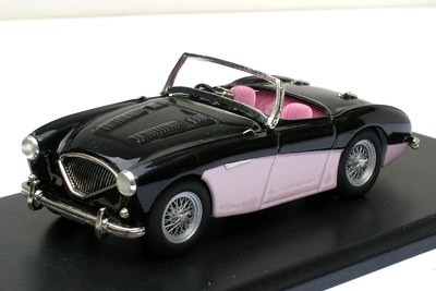 1/43rd scale white metal model of the Austin Healey 100M, finished in Black with Pink accents as used by the Donald Healey Motor Company during a promotional tour of the US in the 1956. Model is handbuilt in England by SMTS exclusively for mimodels, and is in New Condition, mounted on plinth with outer box.