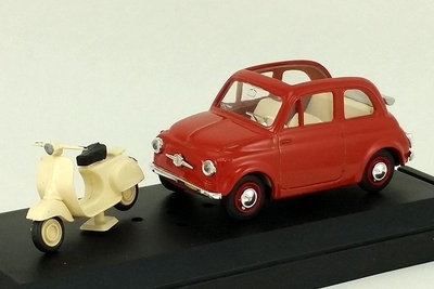 obsolete 1/43rd scale model of Fiat 500 finished in Red with open roof